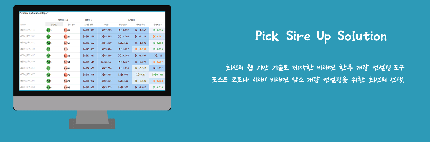 서비스 목표 - Pick Sire Up Solution 서비스의 목표는 한우 개량의 목적과 동일합니다. 한우 개량의 본 목적은 암소의 능력을 파악하여 알맞은 정액을 선택하여 태어날 송아지의 능력을 부모세대 보다 더 향상시키는 것입니다. 이를 위해서 현재 암소가 가지고 있는 장점과 단점을 정확히 파악하고 단점을 보완하거나 장점을 강화하면서도 근교계수가 높지 않도록 철저한 계획교배가 필수적입니다. 하지만 아직도 일부 한우 사육 농가에서는 인기가 있는 또는 능력이 좋은 씨수소라는 소문에 편승하여 내 암소의 능력과는 상관없이 교배를 시키고 계십니다. Pick Sire Up Solution - 포스트 코로나 시대! 비대면 암소 개량 컨설팅을 위한 웹서비스는 선택이 아니라 필수 입니다.